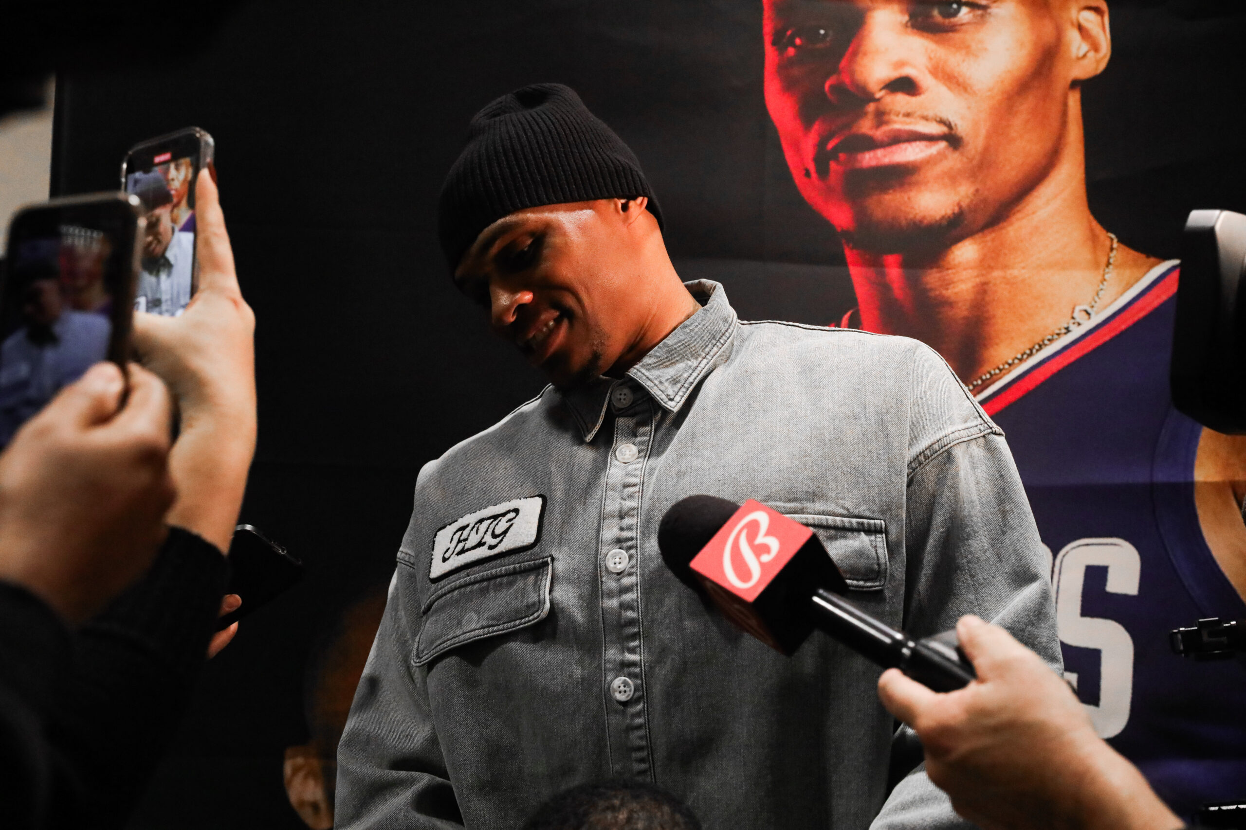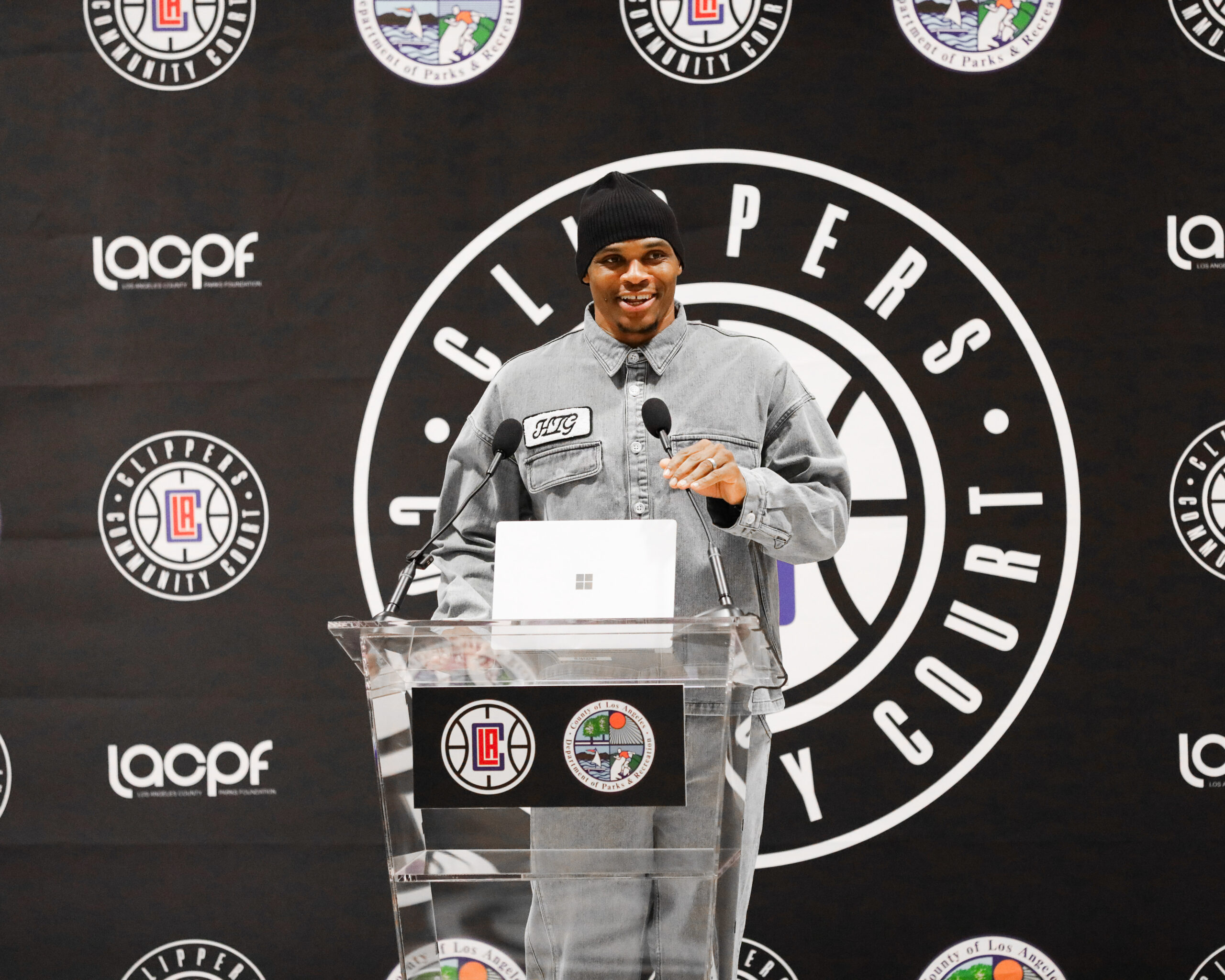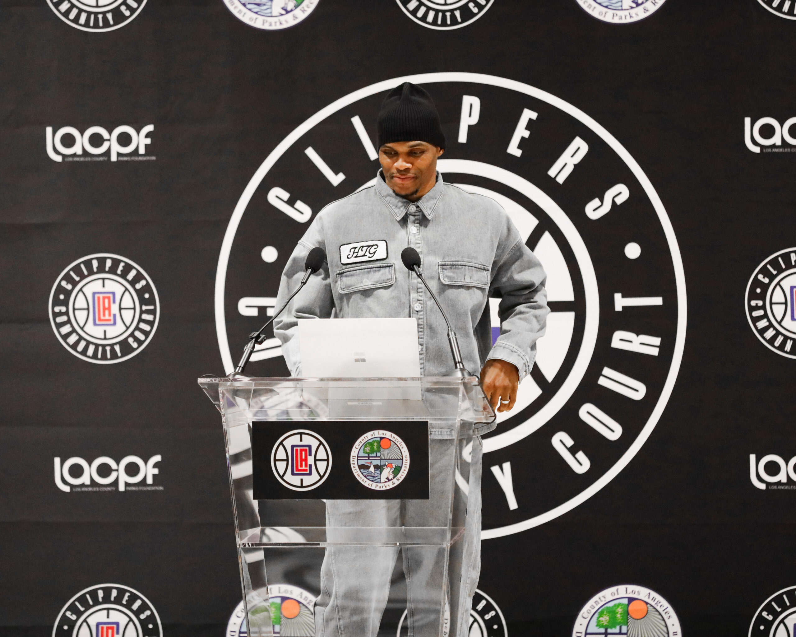 Los Angeles Clippers guard Russell Westbrook speaking at the Russell Westbrook Community Court unveiling. Photo taken De’Angelo Scruggs